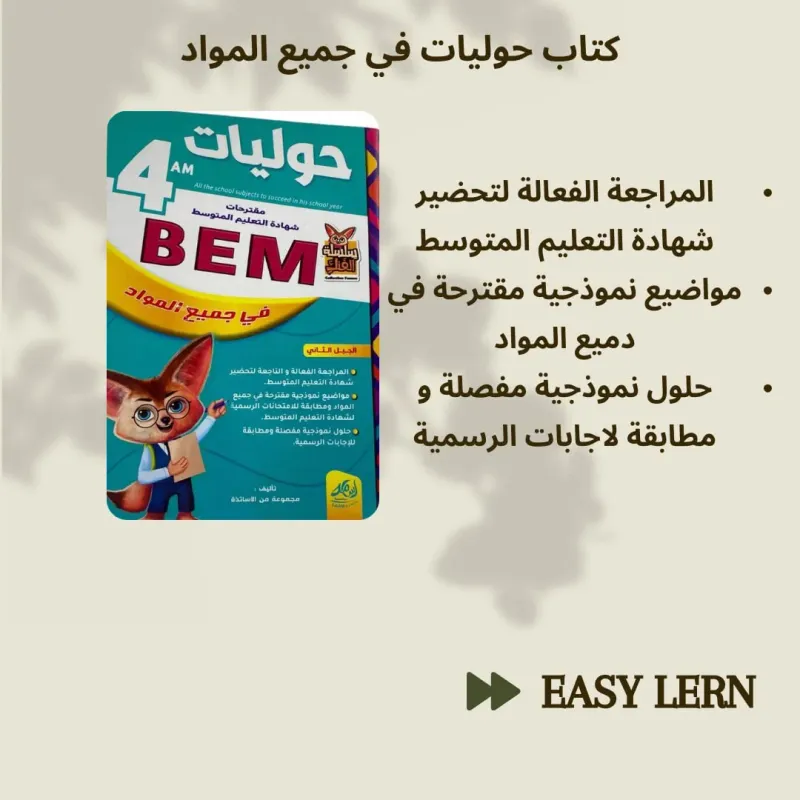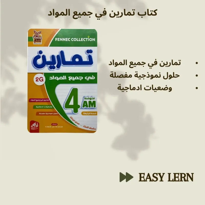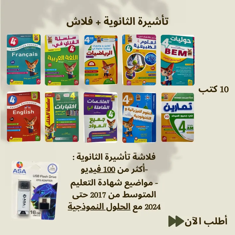 تأشيرة الثانوية: 10 كتب تغطي جميع مواد الرابعة متوسط مع شروحات وتمارين ونماذج اختبارات، بالإضافة إلى فلاشة تضم أكثر من 100 فيديو تعليمي ومواضيع bem من 2017 إلى 2024 مع الحلول. اطلب الآن وابدأ مراجعتك بثقة وراحة.