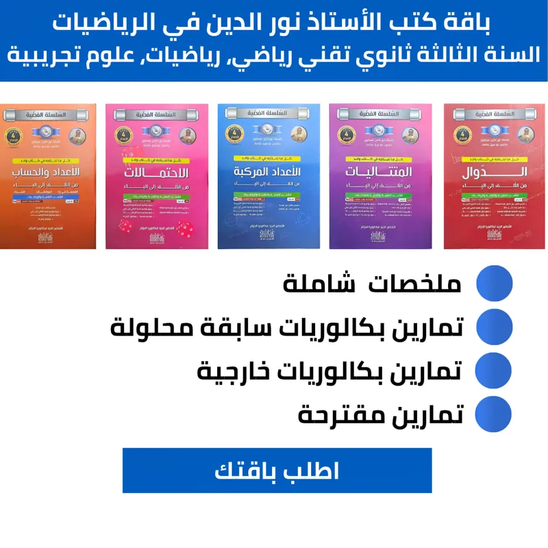 باقة كتب الأستاذ نور الدين عيساوي في الرياضيات السنة الثالثة ثانوي 📘 للشُّعَب: تقني رياضي رياضيات علوم تجريبية ✅ ملخصات شاملة ✅ تمارين بكالوريات سابقة محلولة ✅ تمارين من بكالوريات خارجية ✅ تمارين مقترحة 🔵 اطلبوا باقتكم الآن!