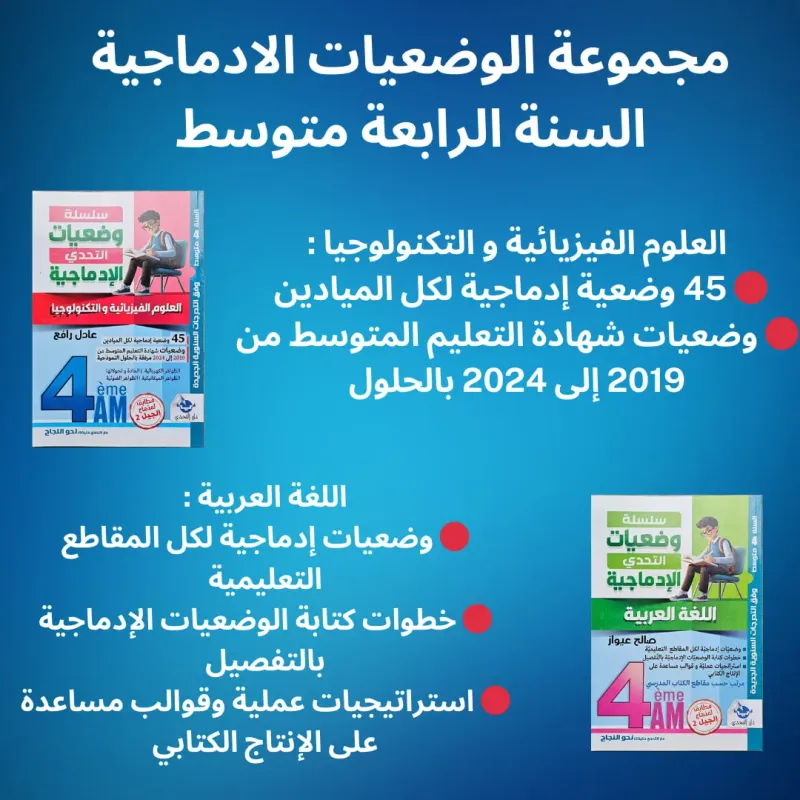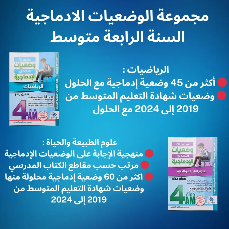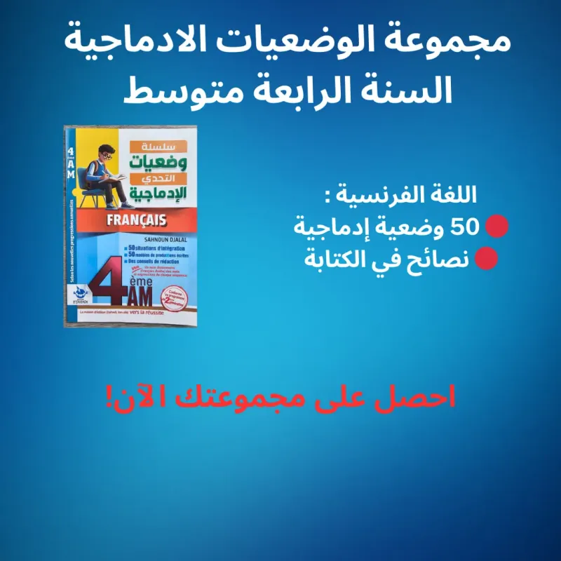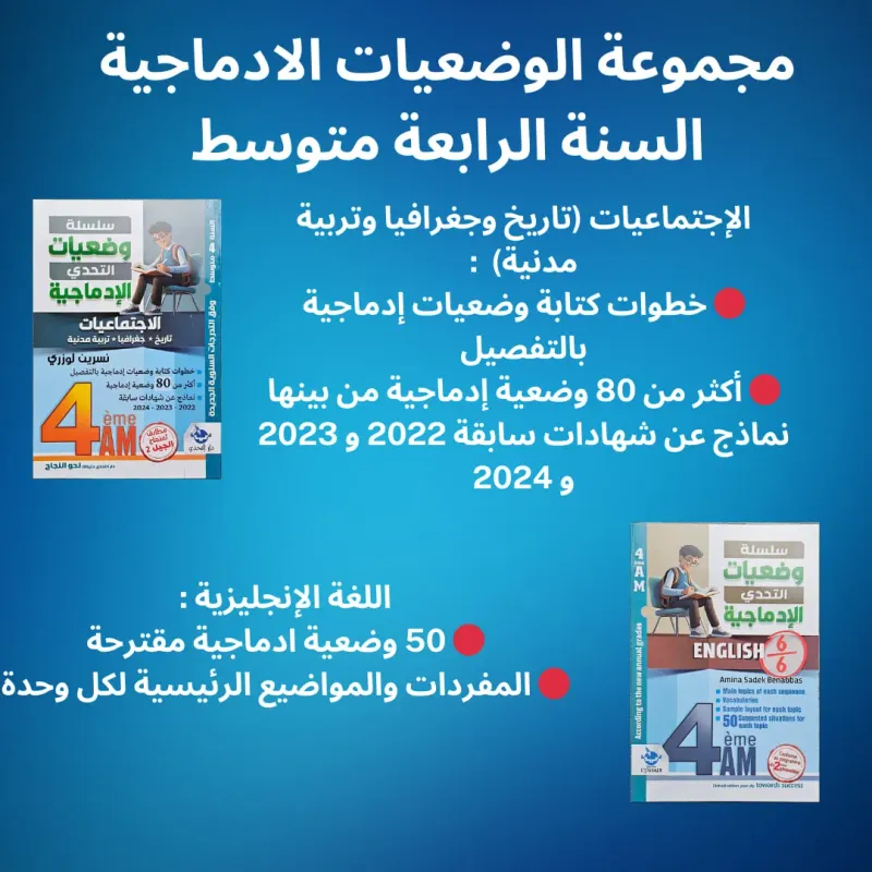 إذا كنتم تبحثون عن وضعيات إدماجية محلولة لمساعدة أبنائكم في المراجعة للاختبارات وشهادة التعليم المتوسط (BEM).، فهذه المجموعة توفر لكم مئات الأمثلة والتطبيقات التي تغطي مواد دراسية مختلفة. للطلب قوموا بملأ معلوماتكم في موقعنا والتوصيل متوفر لأغلب الولايات.
